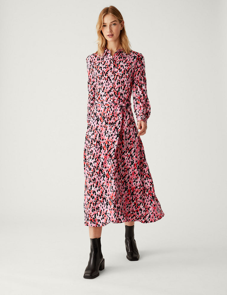 With its striking animal print, this shirt dress makes a perfect choice for smart occasions. It's designed in an easy regular fit and falls to an on-trend midi length. Traditional styling details include a collared neckline, button-up front and buttoned long sleeves. A tie at the waist enhances the feminine feel. M&S Collection: easy-to-wear wardrobe staples that combine classic and contemporary styles.