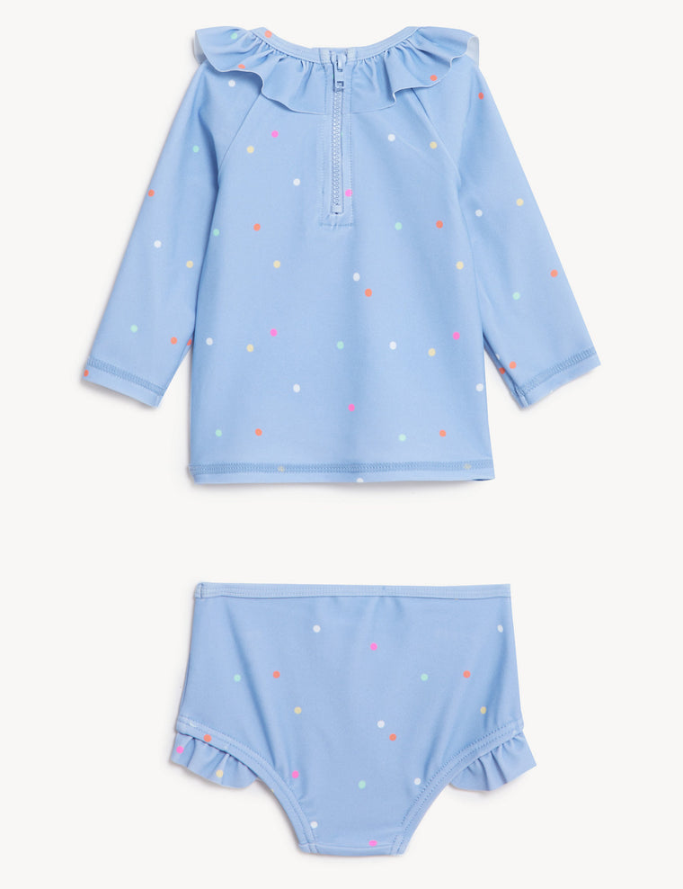They'll love playing at the pool in this sweet seahorse swim set. Decorated with pretty frills and a polka dot pattern, the set includes a long-sleeved top with a zip fastening and matching bottoms. The chlorine-resistant fabric is made with flexible added stretch. Sun Smart UPF50+ fabric, endorsed by the British Skin Foundation, helps to protect against harmful UV rays.