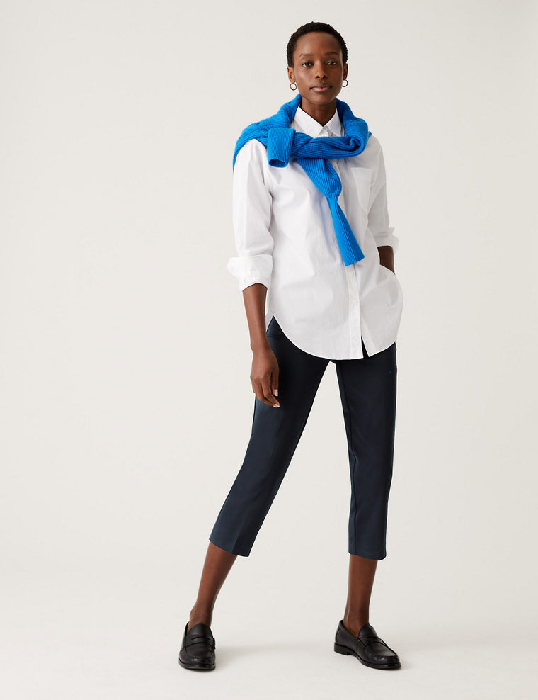 Perfect for everyday styling, these cropped trousers are made from a comfy cotton blend. Slim fit with a flattering high waist. A comfy elasticated insert at the back, and darts on both sides, add definition. Complete with handy side pockets. We only ever use responsibly sourced cotton for our clothes. M&S Collection: easy-to-wear wardrobe staples that combine classic and contemporary styles.