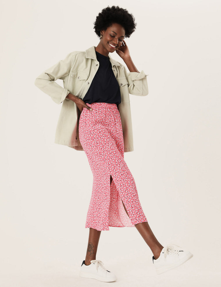 This ditsy floral print skirt offers an effortlessly feminine approach to warm weather dressing. It sits on the waist with a comfortable elasticated band. The side split adds an on-trend finish to the straight shape and midi hemline. Made with sustainably sourced viscose. M&S Collection: easy-to-wear wardrobe staples that combine classic and contemporary styles.
