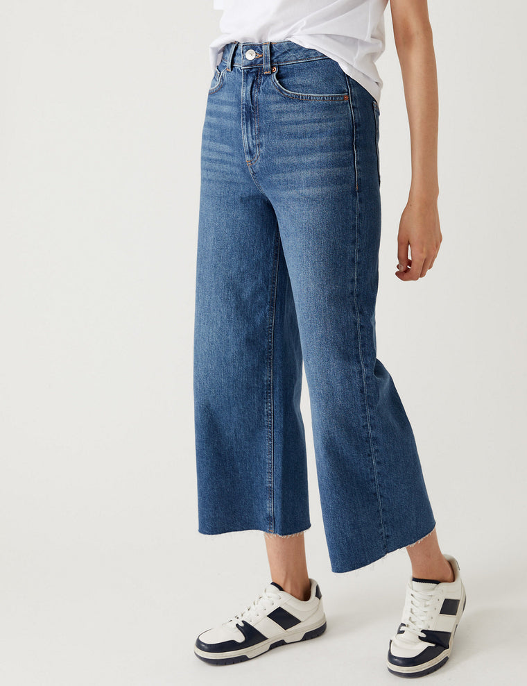 Update your denim collection with these ankle-grazing high-waisted jeans. They come in an on-trend wide-leg fit and are made with added stretch for comfort. A button and zip fastening, metallic hardware and raw hems create an authentic finish. M&S Collection: easy-to-wear wardrobe staples that combine classic and contemporary styles.
