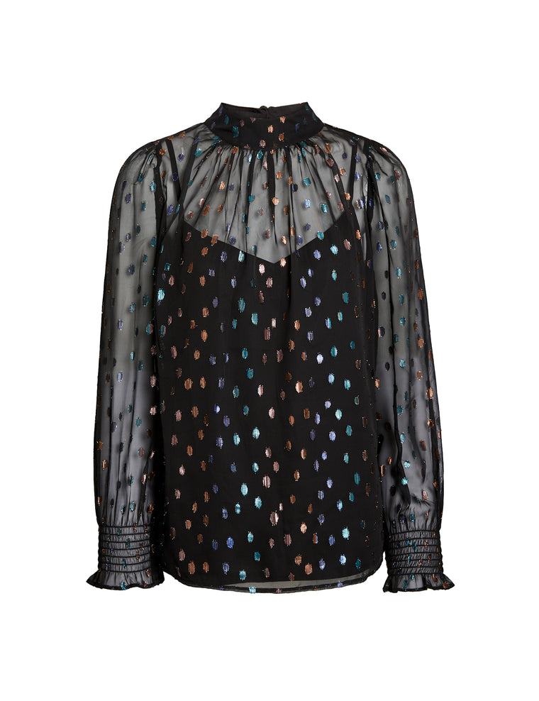 Shimmering jacquard spots lend a party-ready feel to this mesh top. Regular-fit style, with a sophisticated high neckline that fastens with buttons at the back. Long blouson sleeves with ruffle-detail cuffs add volume to the silhouette. Includes a sleeveless cami for coverage. M&S Collection: easy-to-wear wardrobe staples that combine classic and contemporary styles.