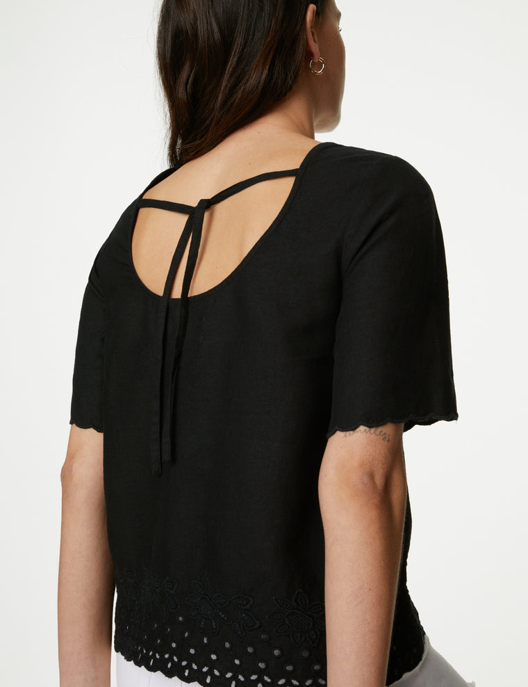 This linen-rich broderie top is a breezy choice for warm days. It's cut in a regular fit, with a round neckline for a timeless look. The short sleeves are finished with intricate trims for a feminine flourish. M&S Collection: easy-to-wear wardrobe staples that combine classic and contemporary styles.