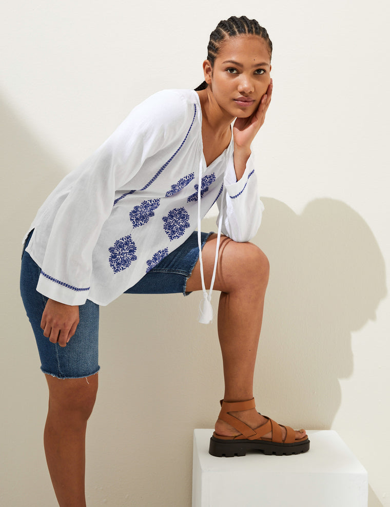 This linen-rich blouse is delicately adorned with embroidered detailing for a feminine feel. It’s cut to a regular fit with long sleeves and a laid-back tie fastening at the neck. M&S Collection: easy-to-wear wardrobe staples that combine classic and contemporary styles.