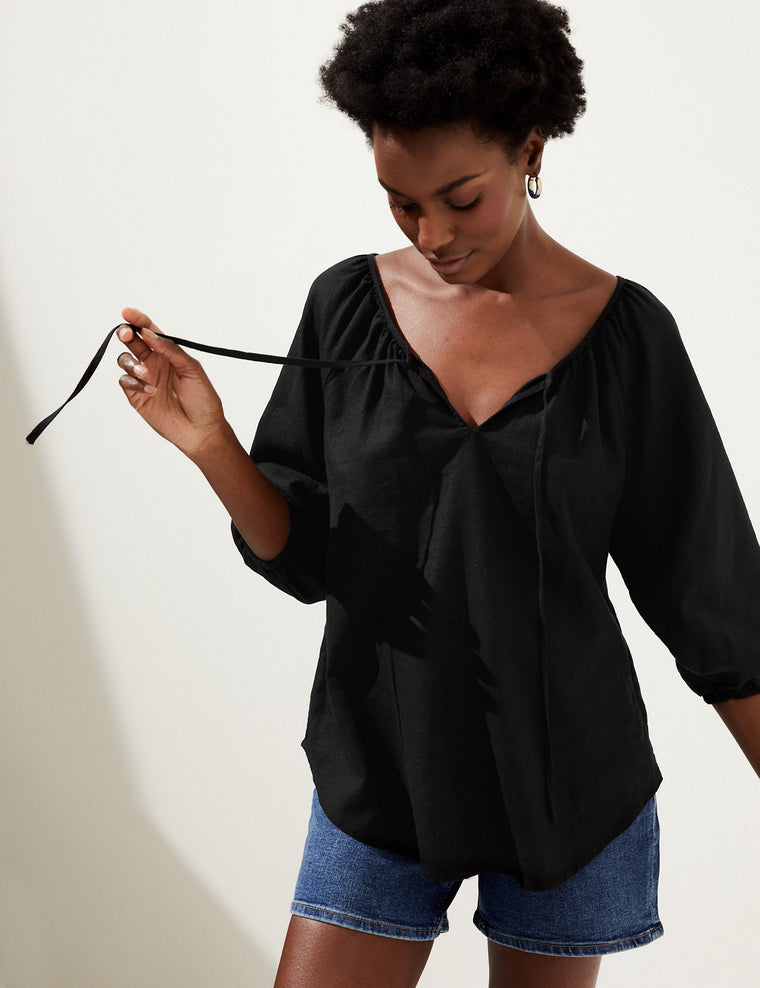 This linen-rich blouse will make a neat addition to your smart-casual wardrobe. It’s cut to a comfy regular fit. Detailed with a versatile tie neckline and voluminous three-quarter sleeves. M&S Collection: easy-to-wear wardrobe staples that combine classic and contemporary styles.