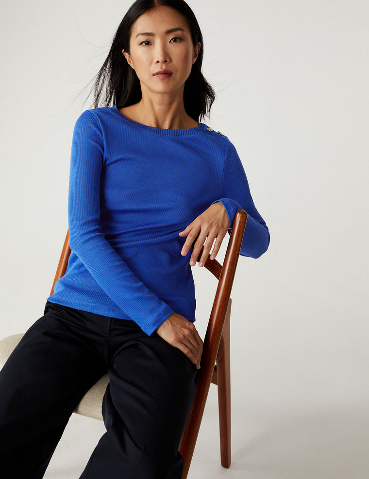 Jewel buttons give this flattering ribbed top extra flair. The fitted shape and long sleeves make it the perfect cool-weather piece that can be layered or worn as the focus of your look, while added stretch ensures all-day comfort. The slash neckline offers an elegant finish. M&S Collection: easy-to-wear wardrobe staples that combine classic and contemporary styles.